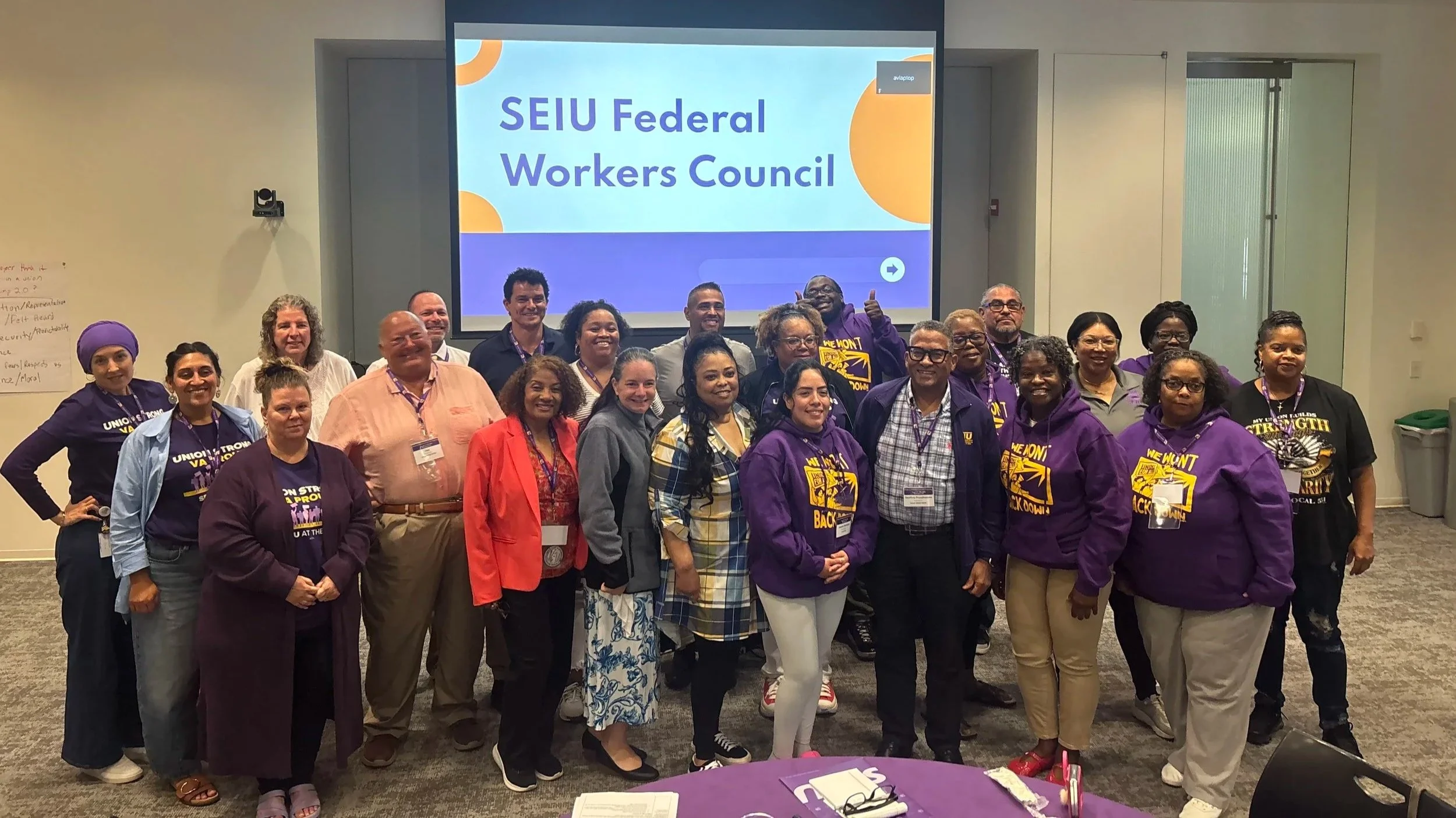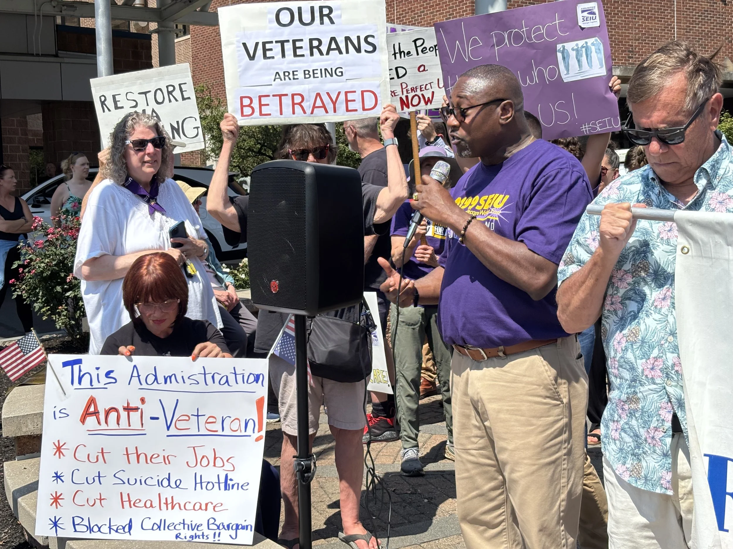 Secretary Collins threatened to layoff more than 80,000 VA employees. Because of pressure created by SEIU members and our partners, that plan is down to 30,000 through normal attrition only, no forced layoffs.